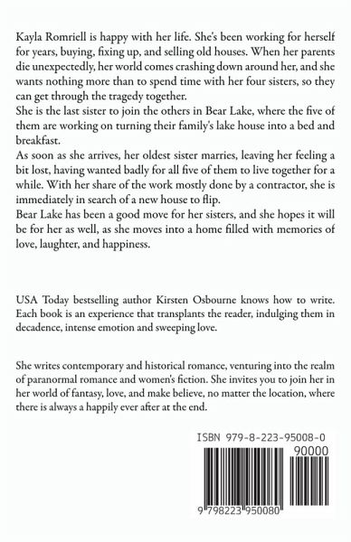 Kayla Romriell is happy with her life. She's been working for herself for years, buying, fixing up, and selling old houses. When her parents die unexpectedly, her world comes crashing down around her, and she wants nothing more than to spend time with her four sisters, so they can get through the tragedy together. She is the last sister to join the others in Bear Lake, where the five of them are working on turning their family's lake house into a bed and breakfast. As soon as she arrives, her oldest sister marries, leaving her feeling a bit lost, having wanted badly for all five of them to live together for a while. With her share of the work mostly done by a contractor, she is immediately in search of a new house to flip. Bear Lake has been a good move for her sisters, and she hopes it will be for her as well, as she moves into a home filled with memories of love, laughter, and happiness.