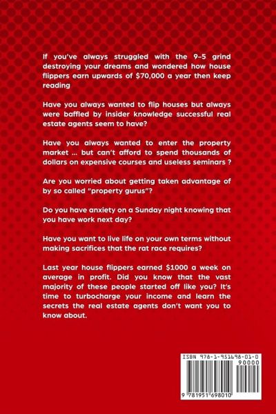 If you’ve always struggled with the 9-5 grind destroying your dreams and wondered how house flippers earn upwards of $70,000 a year then keep reading Have you always wanted to flip houses but always were baffled by insider knowledge successful real estate agents seem to have? Have you always wanted to enter the property market … but can’t afford to spend thousands of dollars on expensive courses and useless seminars ? Are you worried about getting taken advantage of by so called "property gurus"? Do you have anxiety on a Sunday night knowing that you have work next day? Have you want to live life on your own terms without making sacrifices that the rat race requires? Last year house flippers earned $1000 a week on average in profit. Did you know that the vast majority of these people started off like you? It’s time to turbocharge your income and learn the secrets the real estate agents don’t want you to know about. Why Property? Home ownership has almost halved in the past 20 years and yet according to The Guardian, flippers are more profitable than ever, regularly outpacing other investments like the stock market, index funds and cryptocurrencies . On average house flippers earn around $70000 per year in profit after expenses,Why aren't you one of them? In Flipping Houses For Cash you will discover: Why your not getting taken seriously by real estate agents - and what you can do about it (Chapter 16) How to make a profit with your first property - even if you have zero experience in real estate (Chapter 35) The most common ways real estate agents take advantage of buyer - and how to avoid this (chapter 15) How to avoid 99% of the mistakes more seasoned flippers experience and what you can do to avoid them (Chapter 40) The secret negotiation tactics you need to get finally get what you want( Chapter 28) The secrets real estate agents know - and don’t want to tell you (Chapter 14) Why Now? I know what your thinking. This sounds too good to be true. That the information wont work for you, that you’re going to be stuck in the 9-5 forever, left behind.That you’ve failed at property in the past so why will this be different? The fact of the matter is that real estate returns are amongst the oldest and safest forms of income. All you need to do is unlock the mindset the 99% have not utilised. Our book has been designed with you in mind to be as clear and concise as humanly possible. If you know how to read a book, you will have a successful flip.It really is a guide that’s so simple that we can teach a homeless person to become a real estate master. So if your tired of reading books that don’t get to the point and leave you more confused then when you started SCROLL UP AND HIT ADD TO CART NOW