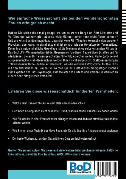 Wie einfache Wissenschaft Sie bei den wunderschönsten Frauen erfolgreich macht.Haben Sie sich schon mal gefragt, warum es wahre Berge an Flirt-Literatur und Verführungs-Wälzern gibt, aber so viele Männer immer noch nicht flirten können? Und wie kommt es überhaupt dazu, dass sich viele Flirt-Theorien kolossal widersprechen?Provokant, aber wahr: Ihr Wahrheitsgehalt ist so hoch wie das Horoskop der Tageszeitung.Denn ihre einzige inhaltliche Grundlage ist die Meinung eines selbsternannten Flirtprofis.Das Buch "Flirt-Wissenschaften" ist der Gegenentwurf zu diesen fragwürdigen Schriften und für alle Männer, die endlich einen gesicherten Flirterfolg erreichen wollen. Platte Sprüche und ausgeschmückte Prahl-Geschichten werden Ihnen nicht aufgetischt. Stattdessen bringen 150 wissenschaftliche Studien auf den Punkt, was die wirkliche Erfolgsformel für Ihre Flirts mit den allerschönsten Frauen ist. Werden Sie mit Hilfe dieses einzigartigen Buches zum Experten der Flirt-Psychologie, zum Meister des Flirtens und werden Sie dadurch zu einem sehr erfolgreichen Verführer!Erfahren Sie diese wissenschaftlich fundierten Wahrheiten:-Welche zehn Themen Sie auf keinem Date anschneiden sollten-Der Ihnen bislang noch nicht bekannte Grund, warum Frauen wirklich Sex haben wollen-Wie Sie das Herz einer Frau schneller schlagen lassen und dadurch attraktiver als andere Männer werden-Wie Sie mit einer Technik der Navy Seals ein für alle Mal Ihre Ansprechangst besiegen-Der beste Wochentag, an dem Sex mit ihrem Date am leichtesten gelingtGreifen Sie zu und nutzen Sie diese und viele weitere bahnbrechende wissenschaftliche Erkenntnisse, damit Sie Ihre Traumfrau WIRKLICH erobern können.