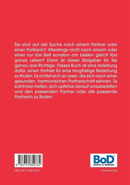 Sie sind auf der Suche nach einem Partner oder einer Partnerin? Allerdings nicht nach einem oder einer nur fürs Bett sondern am besten gleich fürs ganze Leben? Dann ist dieser Ratgeber für Sie genau das Richtige. Dieses Buch ist eine Anleitung dafür, einen Partner für eine langfristige Beziehung zu finden. Es richtet sich an Leser, die sich nach einer gesunden, harmonischen Partnerschaft sehnen. Es soll Ihnen helfen, sich optimal darauf vorzubereiten und den passenden Partner oder die passende Partnerin zu finden.