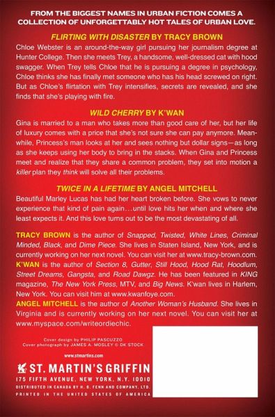 From the biggest names in urban fiction comes a collection of unforgettably hot short stories of urban love. Flirting with Disaster by Tracy Brown Chloe Webster is an around-the-way girl pursuing her journalism degree at Hunter College. Then she meets Trey, a handsome and well dressed cat with hood swagger. When Trey tells Chloe that he is pursuing a degree in psychology, Chloe thinks she has finally met someone who has his head screwed on right. But as Chole's flirtation with Trey intensifies, secrets are revealed and she finds that she's playing with fire. Wild Cherry by K'wan Gina is married to a man who more than takes good care of her, but her life of luxury comes with a price that she's not sure she can pay anymore. Princess' man doesn't see her as any more than dollar signs-as long as she keeps using her body to bring in the stacks. When Gina and Princess meet and realize that they share a common problem, they sent into motion an unforgettable plot that will solve all their problems... Twice in a Lifetime by Angel Mitchell Beautiful Marley Lucas, has had her heart broken before. Vowing to never experience that kind of pain again, until...love hits her when and where she least expects it. And this love turns out to be the most devastating of all.