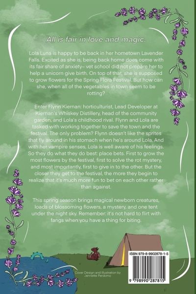 Lola Luna is happy to be back in her hometown, Lavender Falls. Excited as she is, vet school did not prepare her to help a unicorn give birth. On top of that she is suppose to help grow flowers for the Spring Floral Festival. But how can she when all the vegetation in town seems to be rotting? Enter Flynn Kiernan. Horticulturist, lead developer of Kiernan's Whiskey Distillery, head of the community garden and Lola's childhood academic rival. Flynn and Lola are tasked to work together to save the town and the festival. The only problem is Flynn doesn't like the sprites that fly around his stomach when he's around Lola. And Lola with her vampire senses is well aware of his feelings. So they do what they do best and place bets. First to grow the most flowers, first to solve the mystery and most importantly first to give in. But the closer they get to the festival the more they begin to realize that it's much more fun to bet on each other than against. The spring season brings on magical newborn creatures, blossoming flowers, a mystery and one tent under the night sky. Remember it's not hard to flirt with fangs when the other has a thing for biting.