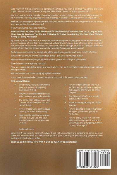 Was your first flirting experience a complete flop? Have you seen a girl that you admire and want to get to know her but haven't the slightest idea where to start or how to go about it? Are you nervous at the thought of approaching her despite getting yourself all psyched up only for all the words and body language you had prepared to disappear whenever you are around her? And are you looking for a guide that will hold you by the hand while teaching you the art of flirting with women like the real Casanova? If you've answered YES, keep reading... You Are About To Enter Into A New Level Of Self Discovery That Will Give You A Leap To Your Next Date By Teaching You The Art O Flirting To Enable You Get Any Girl You Want Without Acting Or Being Awkward! By virtue that you are here, it is clear you've had enough of ruining your chances with beautiful women because of your fear, lameness and awkwardness. You are tired of seeing other men land the most beautiful women around you and want that to change, at least so that you enter the league of men that can get any woman they want by flirting your way to a date! Perhaps you are looking for answers to all the questions going through your mind, including... Why do I freeze around the lady I have been eyeing - why does my mind go blank? Why do I fail whenever I try to flirt with the women I gather the courage to speak with? How do I overcome my fear of rejection? How do I master the flirting game to a point where I can do it everywhere and with anyone, without feeling awkward? What techniques can I use to bring my A-game in flirting? If you have these and other related questions, this book is for you so keep reading. In it, you will learn: · What flirting really is and whether what you've been doing really qualifies as flirting · Why you have failed at least once when trying to get a girl's attention · The connection between your self-confidence and a higher success rate at flirting · How to master your body language to bring your best while flirting · How to understand what women want so that you use it to your advantage while flirting with any woman · How your tone of voice and your verbal cues can make or break your flirting game and how to do it like the pros · The DO's and DON'Ts you should observe while flirting · Powerful flirting techniques for the shy guy · How to develop a deep conversation with your girl without getting all worked up · How to easily create fun and flirty vibes and build magnetic attraction that will get any girl giggling, without coming off as a jerk · And much more Yes, even if you consider yourself awkward and not as confident and outgoing as some men out there, this book will help you master the game in your own way to approach any girl you've been eyeing and effectively get a date!