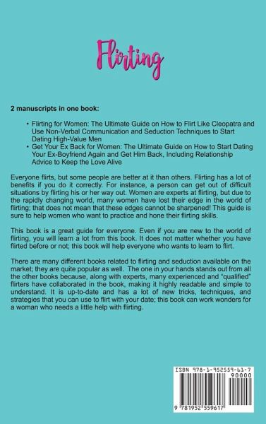 If you've always wanted to attract the man of your dreams, or if you're looking for a way to get your ex back, then keep reading... Two manuscripts in one book:Flirting for Women: The Ultimate Guide on How to Flirt Like Cleopatra and Use Non-Verbal Communication and Seduction Techniques to Start Dating High-Value Men Get Your Ex Back for Women: The Ultimate Guide on How to Start Dating Your Ex-Boyfriend Again and Get Him Back, Including Relationship Advice to Keep the Love Alive Are you sick and tired of not being able to talk to the men you are attracted to? Have you tried sending them signals, but nothing seems to work? Or, are you struggling with the pain after a breakup and looking for tips on how to make up with your ex-boyfriend? If any of these are true, then you've come to the right place! Here's just a tiny fraction of what you'll discover in part 1 of this book:The 23 things to learn about men The four things you should know about flirting Why doing online dates is hurting your progress-and what to do instead How to get the man of your dreams without feeling too embarrassed or awkward Three harmful myths the Internet tells you about online dating How to save a lot of time with just one simple change in your routine A cool trick used by Cleopatra which helps you become the most charming seductress The biggest mistake people make in the matter of flirting and dating The 14 best ways to help you with your flirting journey ...and much, much more! Part 2 of this book contains:Over 20 thought-provoking ideas on how to get the right perspective on the breakup including what, how, and why things went wrong. Five excellent ideas that will make you ponder on whether and why you should work on getting your ex back. Numerous stunning thoughts on understanding men and their needs. Ground-breaking ideas on whether to forgive cheating. Five powerful and effective steps that will help you get your ex back. More than 50 different ideas on how to keep your ex for good and to build a strong, sustainable relationship that will be the envy of all. Take a second to imagine how you'll feel once you get the result, and how your family and friends will react when you snatch the man of your dreams. Or, just imagine yourself happily back with your ex leading a meaningful and purpose-filled life. If any of the things mentioned above appeal to you, scroll up and click "add to cart."