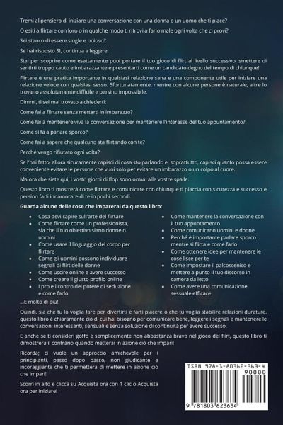Tremi al pensiero di iniziare una conversazione con una donna o un uomo che ti piace? O esiti a flirtare con loro o in qualche modo ti ritrovi a farlo male ogni volta che ci provi? Sei stanco di essere single e noioso? Se hai risposto SI, continua a leggere! Stai per scoprire come esattamente puoi portare il tuo gioco di flirt al livello successivo, smettere di sentirti troppo cauto e imbarazzante e presentarti come un candidato degno del tempo di chiunque! Flirtare è una pratica importante in qualsiasi relazione sana e una componente utile per iniziare una relazione veloce con qualsiasi sesso. Sfortunatamente, mentre con alcune persone è naturale, altre lo trovano assolutamente difficile e persino impossibile. Dimmi, ti sei mai trovato a chiederti: Come fai a flirtare senza metterti in imbarazzo? Come fai a mantenere viva la conversazione per mantenere l'interesse del tuo appuntamento? Come si fa a parlare sporco? Come fai a sapere che qualcuno sta flirtando con te? Perché vengo rifiutato ogni volta? Se l'hai fatto, allora sicuramente capisci di cosa sto parlando e, soprattutto, capisci quanto possa essere conveniente evitare le persone che vuoi solo per evitare un imbarazzo o un colpo al cuore. Ma ora che siete qui, i vostri giorni di flop sono ormai alle vostre spalle. Questo libro ti mostrerà come flirtare e comunicare con chiunque ti piaccia con sicurezza e successo e persino farli innamorare di te in pochi secondi. Guarda alcune delle cose che imparerai da questo libro: - Cosa devi capire sull'arte del flirtare - Come flirtare come un professionista, sia che il tuo obiettivo siano donne o uomini - Come usare il linguaggio del corpo per flirtare - Come gli uomini possono individuare i segnali di flirt delle donne - Come uscire online e avere successo - Come creare il giusto profilo online - I pro e i contro del potere di seduzione e come farlo - Come mantenere la conversazione con il tuo appuntamento - Come comunicano uomini e donne - Perché è importante parlare sporco mentre si flirta e come farlo - Come ottenere idee per mantenere le cose lisce per te - Come impostare il palcoscenico e mettere a punto il tuo discorso in camera da letto - Come avere una comunicazione sessuale efficace ...E molto di più! Quindi, sia che tu lo voglia fare per divertirti e farti piacere o che tu voglia stabilire relazioni durature, questo libro è chiaramente ciò di cui hai bisogno per comunicare bene, leggere i segnali e mantenere le conversazioni interessanti, sensuali e senza soluzione di continuità per avere successo. E anche se ti consideri goffo e semplicemente non abbastanza bravo nel gioco del flirt, questo libro ti dimostrerà il contrario quando metterai in azione ciò che impari! Ricorda; ci vuole un approccio amichevole per i principianti, passo dopo passo, non giudicante e incoraggiante che ti permetterà di mettere in azione ciò che impari! Scorri in alto e clicca su Acquista ora con 1 clic o Acquista ora per iniziare!
