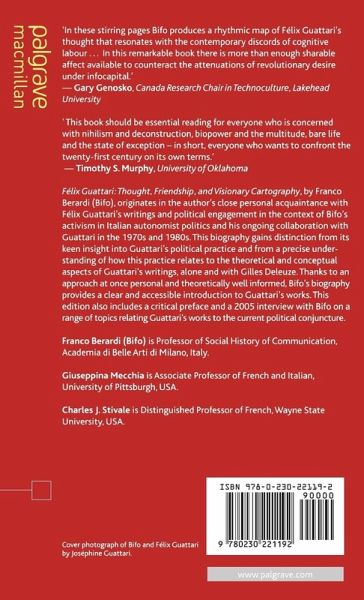 Félix Guattari: Thought, Friendship, and Visionary Cartography, by Franco Berardi 'Bifo', originates in the author's close personal acquaintance with Félix Guattari's writings and political engagement in the context of Berardi Bifo's activism in Italian autonomist politics and his ongoing collaboration with Guattari in the 1970s and 1980s. This biography gains distinction from its keen insight into Guattari's political practice and from a precise understanding of how this practice relates to the theoretical and conceptual aspects of Guattari's writings, alone and with Gilles Deleuze. Thanks to an approach at once personal and theoretically well informed, Bifo's biography provides a clear and accessible introduction to Guattari's works. This edition also includes a critical introduction and a 2005 interview with Bifo on a range of topics relating Guattari's works to the current political conjuncture.