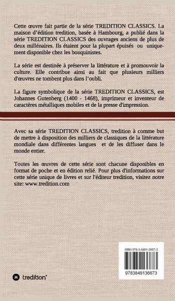 Cette uvre (édition relié) fait partie de la série TREDITION CLASSICS. La maison d édition tredition, basée à Hambourg, a publié dans la série TREDITION CLASSICS des ouvrages anciens de plus de deux millénaires. Ils étaient pour la plupart épuisés ou uniquement disponible chez les bouquinistes. La série est destinée à préserver la littérature et à promouvoir la culture. Avec sa série TREDITION CLASSICS, tredition à comme but de mettre à disposition des milliers de classiques de la littérature mondiale dans différentes langues et de les diffuser dans le monde entier.
