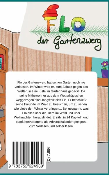 Flo der Gartenzwerg hat seinen Garten noch nie verlassen. Im Winter wird er, zum Schutz gegen das Wetter, in eine Kiste im Gartenhaus gepackt. Da seine Mitbewohner aus dem Wetterhäuschen weggezogen sind, langweilt sich Flo. Er beschließt seine Freunde im Wald zu besuchen, um zu sehen wie diese den Winter verbringen... Sei gespannt, was Flo alles über die Tiere im Wald und über Weihnachten herausfindet. Erzählt in 24 Kapiteln und somit hervorragend als Adventskalender geeignet. Zum Vorlesen und selber lesen.