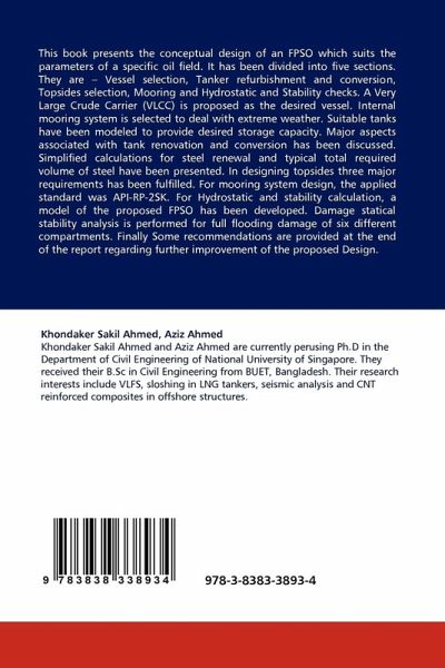 This book presents the conceptual design of an FPSO which suits the parameters of a specific oil field. It has been divided into five sections. They are Vessel selection, Tanker refurbishment and conversion, Topsides selection, Mooring and Hydrostatic and Stability checks. A Very Large Crude Carrier (VLCC) is proposed as the desired vessel. Internal mooring system is selected to deal with extreme weather. Suitable tanks have been modeled to provide desired storage capacity. Major aspects associated with tank renovation and conversion has been discussed. Simplified calculations for steel renewal and typical total required volume of steel have been presented. In designing topsides three major requirements has been fulfilled. For mooring system design, the applied standard was API-RP-2SK. For Hydrostatic and stability calculation, a model of the proposed FPSO has been developed. Damage statical stability analysis is performed for full flooding damage of six different compartments. Finally Some recommendations are provided at the end of the report regarding further improvement of the proposed Design.