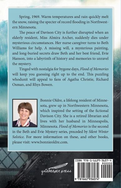 Libraries and readers seeking a cozy mystery atmosphere replete with intrigue, powered by amateur female sleuths who employ every deductive reasoning device available to arrive at the truth, will find Flood of Memories a fine expansion of the characters in the prior Silent Winter Solstice, who continue to evolve their skills and solidify their community connections here. -Midwest Book Review Dive into another daunting mystery with Beth and Evie in Flood of Memories. The river is rising! In the spring of 1969, warm temperatures and rain raise the specter of record flooding in Northwestern Minnesota. The peace of Davison City is further shattered by the sudden death of an elderly resident, Miss Almira Archer. Her nurse caregiver turns to Beth Williams for help. A missing will, a mysterious painting, and long-buried secrets draw Beth and her best friend, Evie Hanson, into a labyrinth of history and memories to unravel the mystery. Tinged with nostalgia for bygone days, Flood of Memories will keep you guessing right up to the end. This puzzling whodunnit will appeal to fans of Agatha Christie, Richard Osman, and Rhys Bowen.