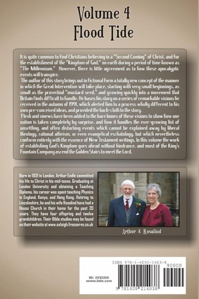Floodtide. (Volume 4 of "Adventures in King's Fountain.") All obstacles having been removed from the King's Fountain company, the progress of God's work in establishing His Kingdom now goes ahead with even greater effect on the nation. But in this part of the story we read of the most wonderful and exciting event of all - the greatest privilege that man can have, that of meeting the Lord Jesus face to face, and to be changed into his new resurrection body.