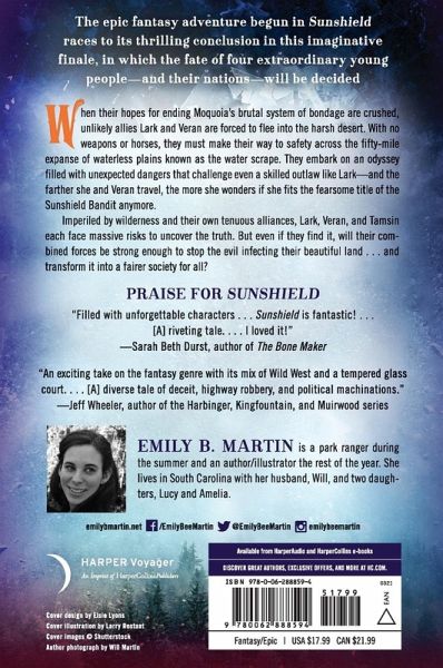 The epic fantasy adventure begun in Sunshield races to its thrilling conclusion in this imaginative finale in which the fate of four extraordinary young people?and their nations?will be decided. When their hopes for ending Moquoia's brutal system of bondage are crushed, unlikely allies Lark and Veran are forced to flee into the harsh desert. With no weapons or horses, they must make their way to safety across the 50-mile expanse of waterless plains known as the water scrape. It is an odyssey filled with unexpected dangers that challenge even a skilled outlaw like Lark?though the farther they travel, the more she wonders if she even fits the fearsome title of the Sunshield Bandit anymore. Injured in the coup to overthrow the Moquoian monarchy, Tamsin, accompanied by Iano, retreat to a safe house, where they await the return of Lark and Veran. Determined to uncover the traitor in the court, they devise a plan to confront the new palace ashoki, Kimela. Imperiled by wilderness and their own tenuous alliances, Lark, Tamsin, and Veran each face massive risks to uncover the truth. But even if they find it, will their combined forces be strong enough to stop the evil infecting their beautiful land . . . and transform it into a fairer society for all?