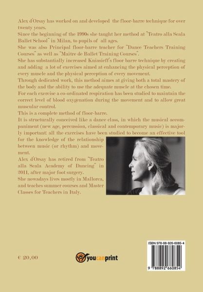 Questo manuale sulla tecnica di Sbarra a Terra, creata da Alex d'Orsay e scritto da lei stessa, è stato adottato come libro di testo dall'Accademia di Danza Teatro alla Scala per il Corso Insegnanti di Danza Accademica. E' dedicato ai danzatori professionisti, agli Insegnanti di Danza e a tutti gli amatori . Principali obbiettivi di questo metodo: postura correttamente allineata, allungamento della muscolatura, potenziamento dell' en dehors, sviluppo della percezione fisica dei movimenti , della concentrazione, della memoria muscolare del movimento. This handbook on the technique of floor-barre, conceived by Alex d'Orsay and written by herself, has been adopted as the official textbook at the Academy of Dancing Teatro alla Scala, Milan This work on the floor, conceived especially for dance teachers and professional dancers, can also be used by amateurs interested in improving any technique, be it classical, modern or contemporary dance. The aims of this method are: a perfect alignement, an improvement of the turnout, a postural awareness, the strengthening of all the core and back muscles