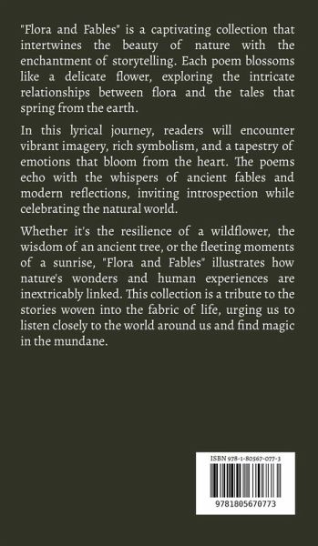 "Flora and Fables" is a captivating collection that intertwines the beauty of nature with the enchantment of storytelling. Each poem blossoms like a delicate flower, exploring the intricate relationships between flora and the tales that spring from the earth. In this lyrical journey, readers will encounter vibrant imagery, rich symbolism, and a tapestry of emotions that bloom from the heart. The poems echo with the whispers of ancient fables and modern reflections, inviting introspection while celebrating the natural world. Whether it's the resilience of a wildflower, the wisdom of an ancient tree, or the fleeting moments of a sunrise, "Flora and Fables" illustrates how nature's wonders and human experiences are inextricably linked. This collection is a tribute to the stories woven into the fabric of life, urging us to listen closely to the world around us and find magic in the mundane.