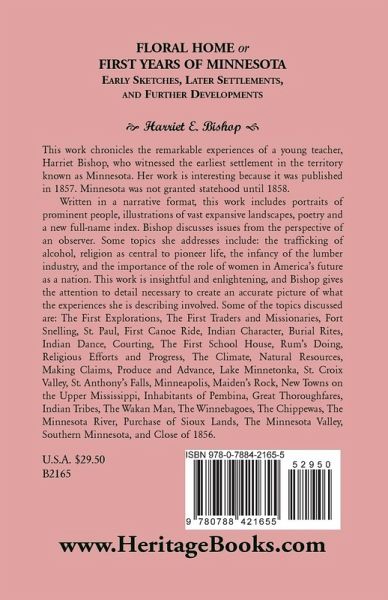 This work chronicles the remarkable experiences of a young teacher, Harriet Bishop, who witnessed the earliest settlement in the territory known as Minnesota. Her work is interesting because it was published in 1857. Minnesota was not granted statehood until 1858. Written in a narrative format, this work includes portraits of prominent people, illustrations of vast expansive landscapes, poetry and a new fullname index. Bishop discusses issues from the perspective of an observer. Some topics she addresses include: the trafficking of alcohol, religion as central to pioneer life, the infancy of the lumber industry, and the importance of the role of women in America's future as a nation. This work is insightful and enlightening, and Bishop gives the attention to detail necessary to create an accurate picture of what the experiences she is describing, involved. Some of the topics discussed are: The First Explorations, The First Traders and Missionaries, Fort Snelling, St. Paul, First Canoe Ride, Indian Character, Burial Rites, Indian Dance, Courting, The First School House, Rum's Doing, Religious Efforts and Progress, The Climate, Natural Resources, Making Claims, Produce and Advance, Lake Minnetonka, St. Croix Valley, St. Anthony's Falls, Minneapolis, Maiden's Rock, New Towns on the Upper Mississippi, Inhabitants of Pembina, Great Thoroughfares, Indian Tribes, The Wakan Man, The Winnebagoes, The Chippewas, The Minnesota River, Purchase of Sioux Lands, The Minnesota Valley, Southern Minnesota, and Close of 1856.