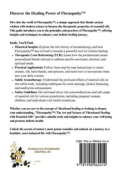 Discover the Healing Power of Floraopathy¿ Dive into the world of Floraopathy¿, a unique approach that blends ancient wisdom with modern science to harness the therapeutic properties of essential oils. This guide introduces you to the principles and practices of Floraopathy¿, offering insights and techniques to enhance your holistic healing journey. Inside, You'll Find:Historical Insights: Explore the rich history of aromatherapy and how Floraopathy¿ has evolved to become a powerful tool for holistic healing. Therapeutic Cross Referencing (TCR): Learn how the professionals create personalized blends tailored to address specific emotional, physical, and spiritual needs. Practical Applications: Follow these step-by-step instructions to create creams, oils, bath blends, and spritzers, and learn how to incorporate them into your daily routine. Subtle Aromatherapy: Understand the profound effects of essential oils on the subtle body, including techniques for auric massage, chakra balancing, and meditation enhancement. Safety Guidelines: Get informed about the contraindications and safe usage of essential oils for various populations, including pregnant women, children, and individuals with health conditions. Whether you are new to the concept of vibrational healing or looking to deepen your understanding, "Floraopathy¿: The Art and Science of Vibrational Healing with Essential Oils" provides valuable tools and insights to enhance your well-being and promote holistic health. Unlock the secrets of nature's most potent remedies and embark on a journey to a healthier, more balanced life with Floraopathy¿.