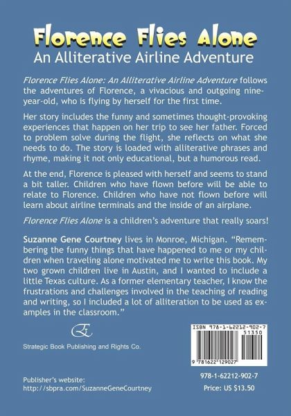 Florence Flies Alone: An Alliterative Airline Adventure follows the adventures of Florence, a vivacious and outgoing nine-year-old, who is flying by herself for the first time. Her story includes the funny and sometimes thought-provoking experiences that happen on her trip to see her father. Forced to problem solve during the flight, she reflects on what she needs to do. The story is loaded with alliterative phrases and rhyme, making it not only educational, but a humorous read. At the end, Florence is pleased with herself and seems to stand a bit taller. Children who have flown before will be able to relate to Florence. Children who have not flown before will learn about airline terminals and the inside of an airplane. Florence Flies Alone is a children's adventure that really soars! Suzanne Gene Courtney lives in Monroe, Michigan. "Remembering the funny things that have happened to me or my children when traveling alone motivated me to write this book. My two grown children live in Austin, and I wanted to include a little Texas culture. As a former elementary teacher, I know the frustrations and challenges involved in the teaching of reading and writing, so I included a lot of alliteration to be used as examples in the classroom." Publisher's website: http://sbpra.com/SuzanneGeneCourtney