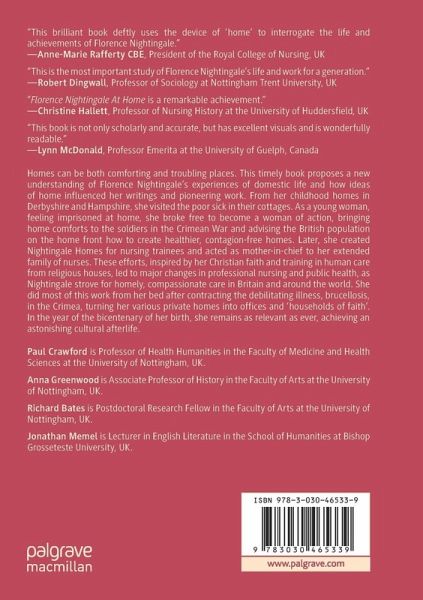 Homes can be both comforting and troubling places. This timely book proposes a new understanding of Florence Nightingale's experiences of domestic life and how ideas of home influenced her writings and pioneering work. From her childhood homes in Derbyshire and Hampshire, she visited the poor sick in their cottages. As a young woman, feeling imprisoned at home, she broke free to become a woman of action, bringing home comforts to the soldiers in the Crimean War and advising the British population on the home front how to create healthier, contagion-free homes. Later, she created Nightingale Homes for nursing trainees and acted as mother-in-chief to her extended family of nurses. These efforts, inspired by her Christian faith and training in human care from religious houses, led to major changes in professional nursing and public health, as Nightingale strove for homely, compassionate care in Britain and around the world. Shedid most of this work from her bed after contracting the debilitating illness, brucellosis, in the Crimea, turning her various private homes into offices and 'households of faith'. In the year of the bicentenary of her birth, she remains as relevant as ever, achieving an astonishing cultural afterlife.