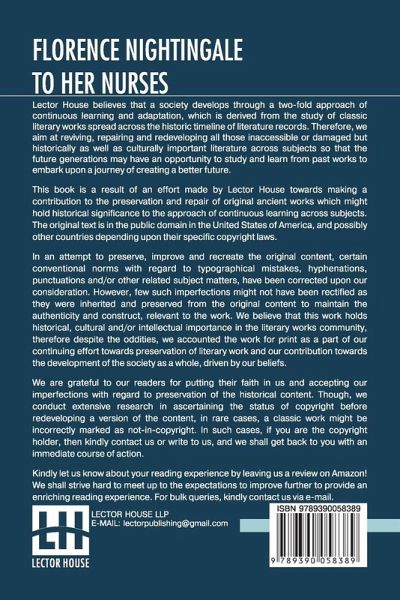 Florence Nightingale To Her Nurses: A Selection From Miss Nightingale's Addresses To Probationers And Nurses Of The Nightingale School At St. Thomas's Hospital Edited, With Preface By Rosalind Nash This book is a result of an effort made by us towards making a contribution to the preservation and repair of original classic literature. In an attempt to preserve, improve and recreate the original content, we have worked towards: 1. Type-setting & Reformatting: The complete work has been re-designed via professional layout, formatting and type-setting tools to re-create the same edition with rich typography, graphics, high quality images, and table elements, giving our readers the feel of holding a 'fresh and newly' reprinted and/or revised edition, as opposed to other scanned & printed (Optical Character Recognition - OCR) reproductions. 2. Correction of imperfections: As the work was re-created from the scratch, therefore, it was vetted to rectify certain conventional norms with regard to typographical mistakes, hyphenations, punctuations, blurred images, missing content/pages, and/or other related subject matters, upon our consideration. Every attempt was made to rectify the imperfections related to omitted constructs in the original edition via other references. However, a few of such imperfections which could not be rectified due to intentional\unintentional omission of content in the original edition, were inherited and preserved from the original work to maintain the authenticity and construct, relevant to the work. We believe that this work holds historical, cultural and/or intellectual importance in the literary works community, therefore despite the oddities, we accounted the work for print as a part of our continuing effort towards preservation of literary work and our contribution towards the development of the society as a whole, driven by our beliefs. We are grateful to our readers for putting their faith in us and accepting our imperfections with regard to preservation of the historical content. HAPPY READING!