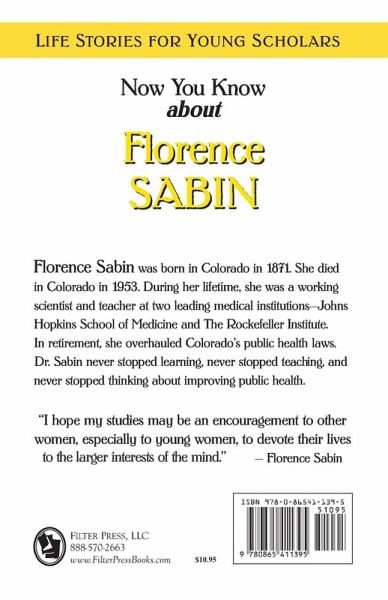 Florence Sabin was born in Colorado in 1871. She died in Colorado in 1953. During her lifetime, she was a working scientist and teacher at two leading medical institutions-Johns Hopkins School of Medicine and The Rockefeller Institute. In retirement, she overhauled Colorado's public health laws. Dr. Sabin never stopped learning, never stopped teaching, and never stopped thinking about improving public health. "I hope my studies may be an encouragement to other women, especially to young women, to devote their lives to the larger interests of the mind." -Florence Sabin