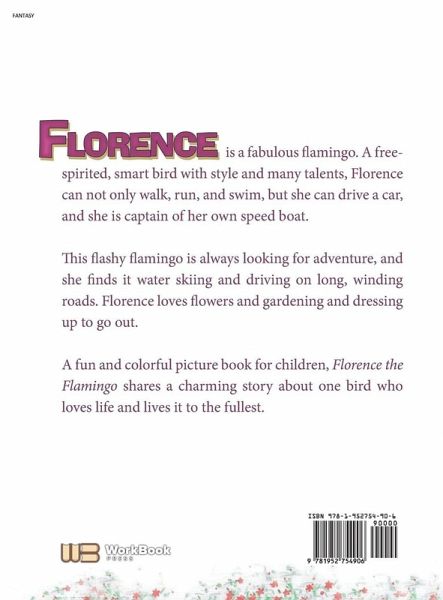 Florence is a fabulous flamingo. A free-spirited, smart bird with style and many talents, Florence can not only walk, run, and swim, but she can drive a car, and she is captain of her own speed boat. This flashy flamingo is always looking for adventure, and she finds it water skiing and driving on long, winding roads. Florence loves flowers and gardening and dressing up to go out. A fun and colorful picture book for children, Florence the Flamingo shares a charming story about one bird who loves life and lives it to the fullest.