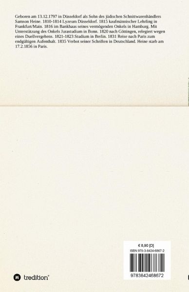 Geboren am 13.12.1797 in Düsseldorf als Sohn des jüdischen Schnittwarenhändlers Samson Heine. 1810-1814 Lyzeum Düsseldorf. 1815 kaufmännischer Lehrling in Frankfurt/Main. 1816 im Bankhaus seines vermögenden Onkels in Hamburg. Mit Unterstützung des Onkels Jurastudium in Bonn. 1820 nach Göttingen, relegiert wegen eines Duellvergehens. 1821-1823 Studium in Berlin. 1831 Reise nach Paris zum endgültigen Aufenthalt. 1835 Verbot seiner Schriften in Deutschland. Heine starb am 17.2.1856 in Paris.
