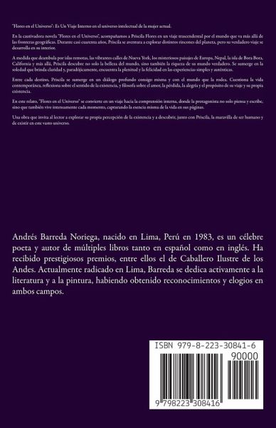"Flores en el Universo: Un Viaje Interior" En la cautivadora novela "Flores en el Universo", acompañamos a Priscila Flores en un viaje trascendental por el mundo que va más allá de las fronteras geográficas. Durante cuarenta años, Priscila se aventura a explorar distintos rincones del planeta, pero su verdadero viaje se desarrolla en su interior. A medida que viaja por islas remotas, Nepal, las vibrantes calles de Nueva York, los misteriosos paisajes de Europa y más allá, Priscila descubre no solo la belleza del mundo, sino también la riqueza de su mundo interior. Se sumerge en la soledad que brinda claridad y, paradójicamente, encuentra la plenitud y la felicidad en las experiencias simples y auténticas. Entre cada destino, Priscila se sumerge en un diálogo profundo consigo misma y con el mundo que la rodea. Cuestiona la vida contemporánea, reflexiona sobre el sentido de la existencia, y filosofa sobre el amor, la pérdida, la alegría y el propósito de su viaje y su propia existencia. En este relato, "Flores en el Universo" se convierte en un viaje hacia la comprensión interior, donde la protagonista no solo piensa y escribe, sino que también vive intensamente cada momento, capturando la esencia misma de la vida en sus páginas. Una obra que invita al lector a explorar su propia percepción de la existencia y a descubrir, junto con Priscila, la maravilla de ser humano y de existir en este vasto universo.