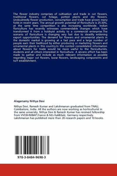 The flower industry comprises of cultivation and trade in cut flowers, traditional flowers, cut foliage, potted plants and dry flowers. Undoubtedly flower production, consumption and trade have grown many folds in recent years. The annual growth potential of floriculture is 25-30%, at the same time competition is also increasing worldwide. Indian floriculture has recently witnesses commendable changes which have transformed it from a hobbyist activity to a commercial enterprise.The scenario of floriculture is changing very fast due to steadily widening export opportunities. The demand for flowers and ornamental plants in the domestic market is growing at a fast pace and a large number of people earn their livelihood by either producing or marketing flowers and ornamental plants in this country.In this context consolidated information about flowers for trade would be more useful to the floriculturists, students and all others interested in floriculture. A sincere effort has been made to gather and include as much relevant information as possible regarding major cut flowers, loose flowers, landscaping components and turf establishment.