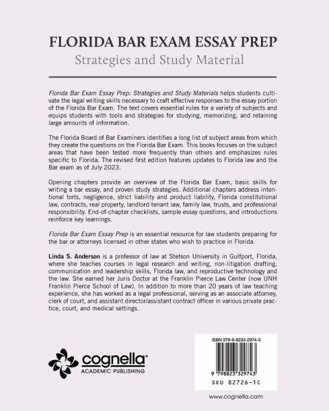 Florida Bar Exam Essay Prep: Strategies and Study Materials helps students cultivate the legal writing skills necessary to craft effective responses to the essay portion of the Florida Bar Exam. The text covers essential rules for a variety of subjects and equips students with tools and strategies for studying, memorizing, and retaining large amounts of information. The Florida Board of Bar Examiners identifies a long list of subject areas from which they create the questions on the Florida Bar Exam. This books focuses on the subject areas that have been tested more frequently than others and emphasizes rules specific to Florida. The revised first edition features updates to Florida law and the Bar exam as of July 2023. Opening chapters provide an overview of the Florida Bar Exam, basic skills for writing a bar essay, and proven study strategies. Additional chapters address intentional torts, negligence, strict liability and product liability, Florida constitutional law, contracts, real property, landlord-tenant law, family law, trusts, and professional responsibility. End-of-chapter checklists, sample essay questions, and introductions reinforce key learnings. Florida Bar Exam Essay Prep is an essential resource for law students preparing for the bar or attorneys licensed in other states who wish to practice in Florida.