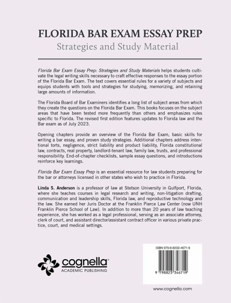 Florida Bar Exam Essay Prep: Strategies and Study Materials helps students cultivate the legal writing skills necessary to craft effective responses to the essay portion of the Florida Bar Exam. The text covers essential rules for a variety of subjects and equips students with tools and strategies for studying, memorizing, and retaining large amounts of information. The Florida Board of Bar Examiners identifies a long list of subject areas from which they create the questions on the Florida Bar Exam. This books focuses on the subject areas that have been tested more frequently than others and emphasizes rules specific to Florida. The revised first edition features updates to Florida law and the Bar exam as of July 2023. Opening chapters provide an overview of the Florida Bar Exam, basic skills for writing a bar essay, and proven study strategies. Additional chapters address intentional torts, negligence, strict liability and product liability, Florida constitutional law, contracts, real property, landlord-tenant law, family law, trusts, and professional responsibility. End-of-chapter checklists, sample essay questions, and introductions reinforce key learnings. Florida Bar Exam Essay Prep is an essential resource for law students preparing for the bar or attorneys licensed in other states who wish to practice in Florida.