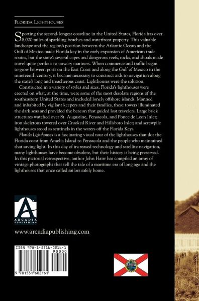 Sporting the second-longest coastline in the United States, Florida has over 8,000 miles of sparkling beaches and waterfront property. This valuable landscape and the region's position between the Atlantic Ocean and the Gulf of Mexico made Florida key in the early expansion of American trade routes, but the state's several capes and dangerous reefs, rocks, and shoals made travel quite perilous to unwary mariners. When commerce and traffic began to grow between ports on the East Coast and along the Gulf of Mexico in the nineteenth century, it became necessary to construct aids to navigation along the state's long and treacherous coast. Lighthouses were the solution. Constructed in a variety of styles and sizes, Florida's lighthouses were erected on what, at the time, were some of the most desolate regions of the southeastern United States and included lonely offshore islands. Manned and inhabited by vigilant keepers and their families, these towers illuminated the dark seas and provided the beacon that guided lost travelers. Large brick structures watched over St. Augustine, Pensacola, and Ponce de Leon Inlet; iron skeletons towered over Crooked River and Hillsboro Inlet; and screwpile lighthouses stood as sentinels in the waters off the Florida Keys.