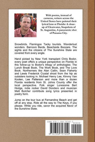 More than two dozen poets musing on the subject of Florida. Edited by Chris Bodor and featuring a foreword by Glenda Bailey-Mershon. With poems, instead of cameras, poets take snapshots of life. Writers from across America point their lyrical lens on Florida - the Sunshine State. Hand-picked, like Satsuma oranges from wind swept branches, every poet has contributed a unique snapshot. Northerners like Alan Catlin, Sean Flaherty, and Lewis Frederick Crystal weigh-in as outsiders looking in. Michael Henry Lee, Kimmy Van Kooten, Lee Patterson, and a dozen St. Johns County residents offer the local perspective. Folk singer Lonesome Bert Hodge, indie rocker David Dondero and musician Matt Butcher contribute song lyrics presented in poetry from. Jump on the tour bus at Fernandina Beach and feel free to get off at any stop. Ride all the way to the Keys, if you please. Savoring along the way, the acquired flavor of the Sunshine State.