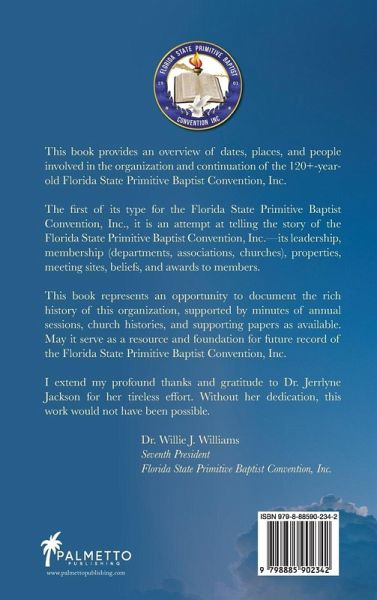 This book provides an overview of dates, places, and people involved in the organization and continuation of the 120+-year old Florida State Primitive Baptist Convention, Inc. The first of its type for the Florida State Primitive Baptist Convention, Inc., it is an attempt at telling the story of the Florida State Primitive Baptist Convention, Inc.-its leadership, membership (departments, associations, churches), properties, meeting sites, beliefs, and awards to members. This book represents an opportunity to document the rich history of this organization, supported by minutes of annual sessions, church histories, and supporting papers as available. May it serve as a resource and foundation for future record of the Florida State Primitive Baptist Convention, Inc. I extend my profound thanks and gratitude to Dr. Jerrlyne Jackson for her tireless effort. Without her dedication, this work would not have been possible. Dr. Willie J. Williams Seventh President Florida State Primitive Baptist Convention, Inc.