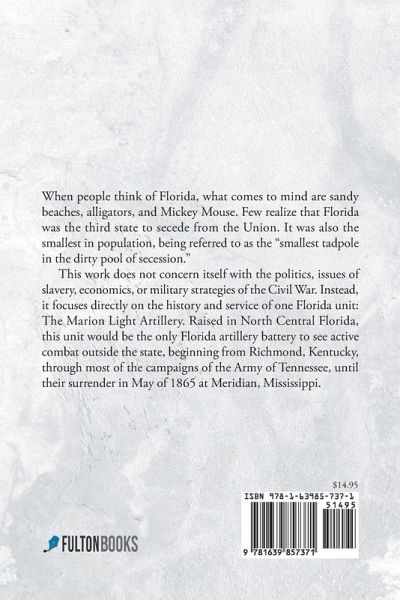 When people think of Florida, what comes to mind are sandy beaches, alligators, and Mickey Mouse. Few realize that Florida was the third state to secede from the Union. It was also the smallest in population, being referred to as the "smallest tadpole in the dirty pool of secession." This work does not concern itself with the politics, issues of slavery, economics, or military strategies of the Civil War. Instead, it focuses directly on the history and service of one Florida unit: The Marion Light Artillery. Raised in North Central Florida, this unit would be the only Florida artillery battery to see active combat outside the state, beginning from Richmond, Kentucky, through most of the campaigns of the Army of Tennessee, until their surrender in May of 1865 at Meridian, Mississippi.