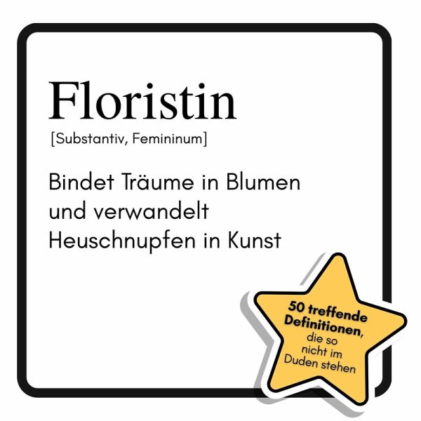 Blumen sind langweilig? Von wegen! "Floristin: Bindet Träume in Blumen und verwandelt Heuschnupfen in Kunst" zeigt, wie aus Pollenexplosionen, Dornenhandschuhen und Regenwurmtaxis echte Meisterwerke entstehen - und warum der Alltag im Blumenladen alles andere als duftend-harmlos ist. Wer wissen will, was hinter dem Cellophanrauschen steckt und wie ein Allergikerapplaus klingt, findet hier die witzigsten Antworten.Für wen dieses Buch optimal geeignet ist:- Für alle, die Floristik lieben oder den Beruf mit Humor sehen- Für Fans von kreativen Geschenkideen mit Augenzwinkern- Für Menschen, die Blumen nicht nur als Deko betrachten50 originelle Definitionen und liebevoll gezeichnete Illustrationen machen "Floristin: Bindet Träume in Blumen und verwandelt Heuschnupfen in Kunst" zum perfekten Begleiter für alle, die den Duft von Schnittblumen und den Wahnsinn des Floristenalltags feiern.Das erwartet den Käufer:- 50 humorvolle Definitionen rund um den Floristenberuf- Passende Illustrationen zu jedem Begriff- Ein Geschenk für Blumenfans und Branchenkenner- Floristik mit einer Prise Selbstironie