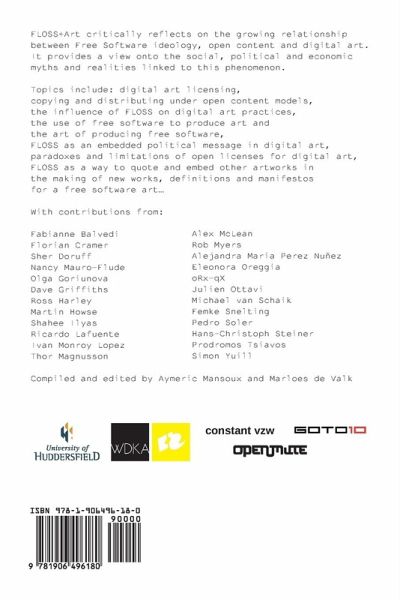 FLOSS+Art critically reflects on the growing relationship between Free Software ideology, open content and digital art. It provides a view onto the social, political and economic myths and realities linked to this phenomenon. Topics include: digital art licensing, copying and distributing under open content models, the influence of FLOSS on digital art practices, the use of free software to produce art and the art of producing free software, FLOSS as an embedded political message in digital art, paradoxes and limitations of open licenses for digital art, FLOSS as a way to quote and embed other artworks in the making of new works, definitions and manifestos for a free software art... With contributions from: Fabianne Balvedi, Florian Cramer, Sher Doruff, Nancy Mauro Flude, Olga Goriunova, Dave Griffiths, Ross Harley, Martin Howse, Shahee Ilyas, Ricardo Lafuente, Ivan Monroy Lopez, Thor Magnusson, Alex McLean, Rob Myers, Alejandra Maria Perez Nuñez, Eleonora Oreggia, oRx-qX, Julien Ottavi, Michael van Schaik, Femke Snelting, Pedro Soler, Hans Christoph Steiner, Prodromos Tsiavos, Simon Yuill. Compiled and edited by Aymeric Mansoux and Marloes de Valk.
