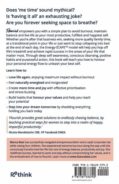 Does 'me time' sound mythical? Is 'having it all' an exhausting joke? Are you forever seeking space to breathe? Flourish provides you with a simple plan to avoid burnout, maintain balance and live life as your most productive, fulfilled and happiest self. Whether you're after that business win, seeking more quality family time, at a transitional point in your life or just want to stop collapsing into bed at the end of each day, the Energy-SCAPE model will help you hop off life's treadmill and achieve rapid success in the areas of your life that matter most. Through deep self-awareness, conscious cleansing, positive habits and purposeful action, this book will teach you how to honour your personal energy flow to unleash your best self. Flourish is a transformational guide for ambitious women buffeted by the whirlwind of modern life. Read this book and learn how to: · Love life again, enjoying maximum impact without burnout · Feel naturally energised and invigorated · Create more time and joy with effective prioritisation and stress-busting · Build habits that honour your values and help you reach your potential · Step into your dream tomorrow by shedding everything holding you back today