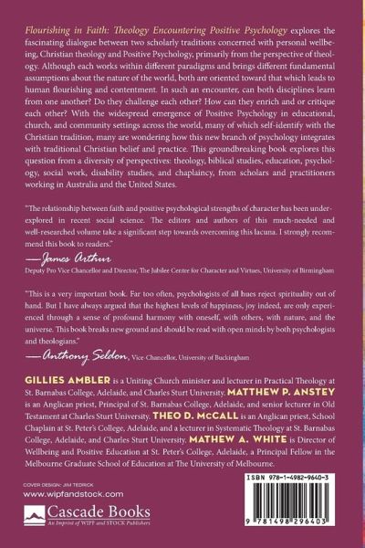 Gillies Ambler is a Uniting Church minister and lecturer in Practical Theology at St. Barnabas College, Adelaide, and Charles Sturt University. Matthew Anstey is an Anglican priest, Principal of St. Barnabas College, Adelaide, and senior lecturer in Old Testament at Charles Sturt University. Theo D. McCall is an Anglican priest, School Chaplain at St Peter's College, Adelaide, and a lecturer in Systematic Theology at St Barnabas College, Adelaide, and Charles Sturt University. Mathew A. White is Director of Wellbeing and Positive Education at St Peter's College, Adelaide, a Principal Fellow in the Melbourne Graduate School of Education at The University of Melbourne and Affiliate in the Well-being Institute at Cambridge University.