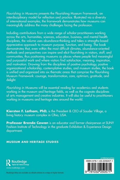 Including contributions from a wide range of scholar-practitioners working across the arts, humanities, sciences, education, business, and mental health disciplines, the volume uses abundance-thinking and takes a strengths-based appreciative approach to museum purpose, function, and being. The book demonstrates that, even within the most difficult climates, abundance-oriented methods and perspectives can inspire and elicit flourishing in visitors, staff, and communities, thus positioning museums as places where people find meaningful and purposeful work and where visitors find satisfaction, meaning, inspiration, and motivation. Drawing from the disciplines of positive psychology, positive organizational scholarship, contemplative studies, and museum studies, the book is unified and organized into six thematic areas that comprise the Flourishing Museum Framework: courage, transformation, care, optimism, gratitude, and delight.