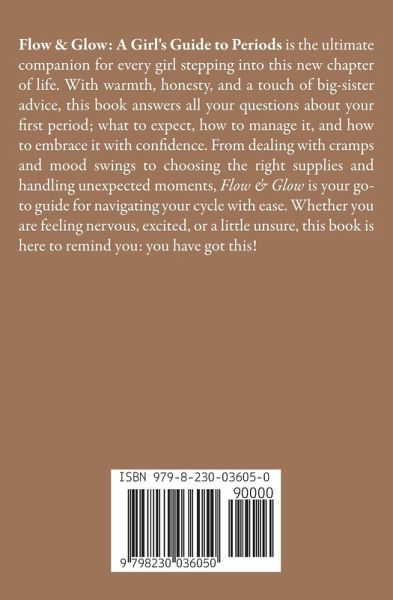 Flow & Glow: A Girl's Guide to Periods is the ultimate companion for every girl stepping into this new chapter of life. With warmth, honesty, and a touch of big-sister advice, this book answers all your questions about your first period; what to expect, how to manage it, and how to embrace it with confidence. From dealing with cramps and mood swings to choosing the right supplies and handling unexpected moments, Flow & Glow is your go-to guide for navigating your cycle with ease. Whether you are feeling nervous, excited, or a little unsure, this book is here to remind you: you have got this!