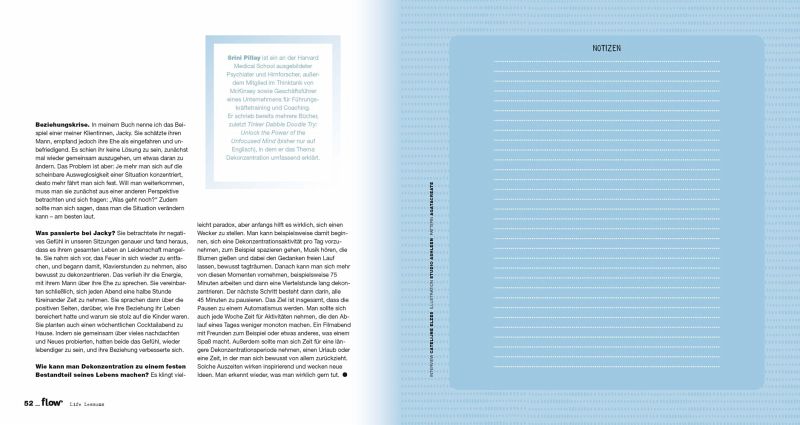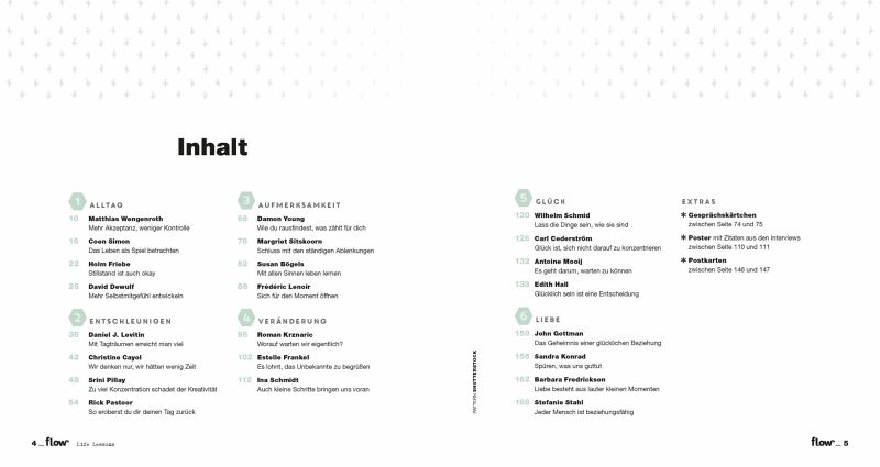 Als wir mit Flow begannen, war uns eines besonders wichtig: Wir wollten von Philosophen, Psychiatern, Achtsamkeitsexperten und anderen Denkern unserer Zeit wissen, welche Einsichten sie über das Leben gewonnen haben. Wir führten eine ganze Reihe von Interviews, in denen die Expertinnen und Experten uns Orientierung und neue Einsichten bescherten. Zum Beispiel, dass wir nicht versuchen sollten, immer glücklich zu sein, oder dass wir die Zeit anders betrachten können, um uns weniger gehetzt zu fühlen. Auch dass wir öfter einfach mal nichts tun sollten. In diesem Heft haben wir die besten Interviews aus sieben Jahren Flow versammelt. Herausgekommen ist ein Ratgeber voller Weisheiten über die Liebe, das Glück, den Alltag, über Aufmerksamkeit, Veränderung und Entschleunigung.