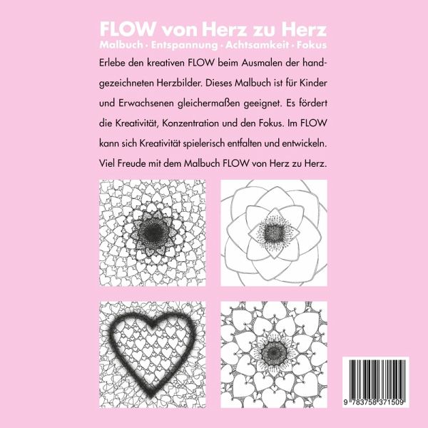 Malbuch mit 45 handgezeichneten Herzbildern, die beim Ausmalen die Kreativität, die Konzentration und die Fokussierung fördern. FLOW: Beim Ausmalen entsteht ein Flow-Erleben und die Kreativität kann sich spielerisch entfalten. Entspannung: Das Malbuch fördert die Entspannung, die Gelassenheit und ein Flow-Erleben wird spürbar. Achtsamkeit / Fokus: Das Malbuch fördert die Achtsamkeit und die Fokussierung.Stressreduktion: Das Malbuch fördert die Gelassenheit, die Klarheit und den inneren Frieden. Kohärenz: Das Ausmalen der Herzbilder hat eine heilsame, stress-reduzierende Wirkung und fördert ein Gefühl von Balance und Harmonie.