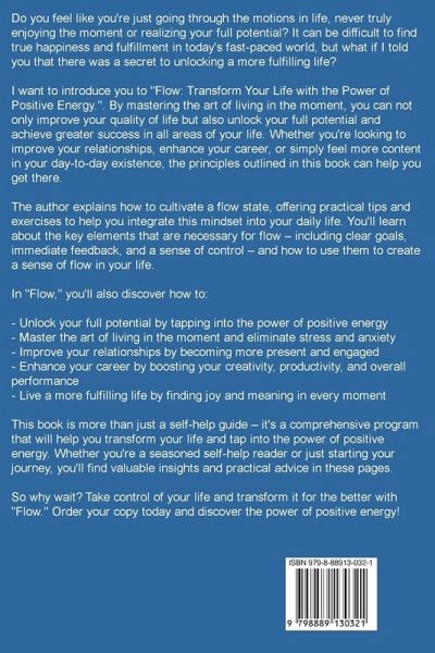 Do you feel like you're just going through the motions in life, never truly enjoying the moment or realizing your full potential? It can be difficult to find true happiness and fulfillment in today's fast-paced world, but what if I told you that there was a secret to unlocking a more fulfilling life? I want to introduce you to "Flow: Transform Your Life with the Power of Positive Energy.". By mastering the art of living in the moment, you can not only improve your quality of life but also unlock your full potential and achieve greater success in all areas of your life. Whether you're looking to improve your relationships, enhance your career, or simply feel more content in your day-to-day existence, the principles outlined in this book can help you get there. The author explains how to cultivate a flow state, offering practical tips and exercises to help you integrate this mindset into your daily life. You'll learn about the key elements that are necessary for flow - including clear goals, immediate feedback, and a sense of control - and how to use them to create a sense of flow in your life. In "Flow," you'll also discover how to: Unlock your full potential by tapping into the power of positive energy Master the art of living in the moment and eliminate stress and anxiety Improve your relationships by becoming more present and engaged Enhance your career by boosting your creativity, productivity, and overall performance Live a more fulfilling life by finding joy and meaning in every moment This book is more than just a self-help guide - it's a comprehensive program that will help you transform your life and tap into the power of positive energy. Whether you're a seasoned self-help reader or just starting your journey, you'll find valuable insights and practical advice in these pages. So why wait? Take control of your life and transform it for the better with "Flow." Order your copy today and discover the power of positive energy!