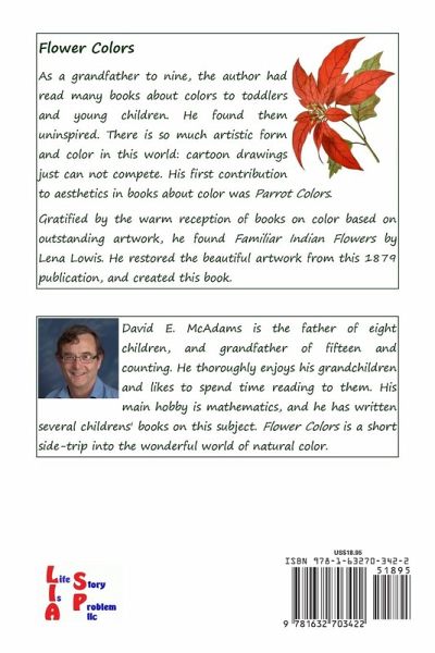 As a grandfather of fifteen, I have read many books about color names to toddlers and young children. I found them uninspired. There is so much beautiful form and color in this world: cartoon drawings just can not compete. My first contribution to aesthetics in color name books was Parrot Colors. Gratified by the warm reception of books on color based on outstanding artwork, I found Familiar Indian Flowers by Lena Lowis. I digitally restored the beautiful artwork from this 1879 publication, and created this book