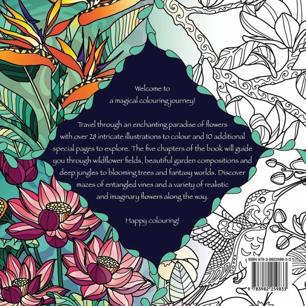 Welcome to a magical colouring journey! Travel through an enchanting paradise of flowers with over 28 intricate illustrations and 10 additional special pages to explore. Discover a variety of realistic and imaginary flowers as the five chapters of the book guide you through wildflower fields, beautiful garden compositions and deep jungles to blooming trees and fantasy worlds. This colouring book contains:Over 28 intricate, hand-drawn illustrations printed on front pages only to minimise bleed-through 10 additional special pages with mazes and inspiration for your own flower creations High quality 70lb paper suitable for a variety of colouring mediums, including watercolour An extra page for colour testing Happy colouring!