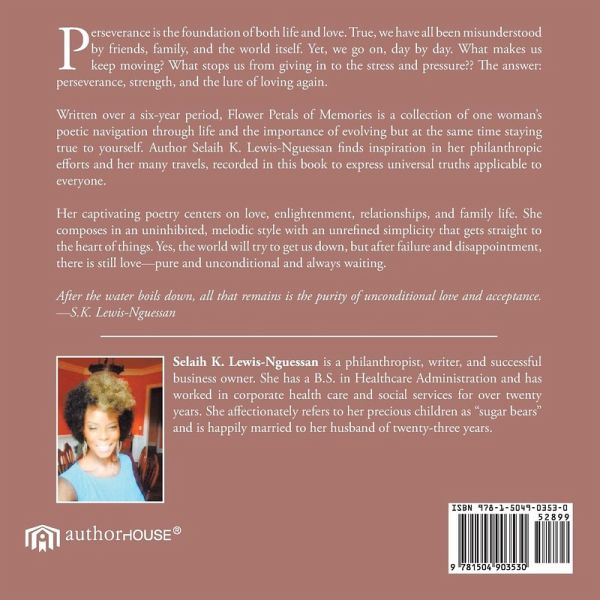 Perseverance is the foundation of both life and love. True, we have all been misunderstood by friends, family, and the world itself. Yet, we go on, day by day. What makes us keep moving? What stops us from giving in to the stress and pressure?? The answer: perseverance, strength, and the lure of loving again. Written over a six-year period, Flower Petals of Memories is a collection of one woman's poetic navigation through life and the importance of evolving but at the same time staying true to yourself. Author Selaih K. Lewis-Nguessan finds inspiration in her philanthropic efforts and her many travels, recorded in this book to express universal truths applicable to everyone. Her captivating poetry centers on love, enlightenment, relationships, and family life. She composes in an uninhibited, melodic style with an unrefined simplicity that gets straight to the heart of things. Yes, the world will try to get us down, but after failure and disappointment, there is still love-pure and unconditional and always waiting. After the water boils down, all that remains is the purity of unconditional love and acceptance.-S.K. Lewis-Nguessan