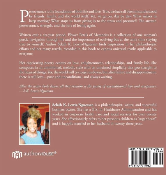 Perseverance is the foundation of both life and love. True, we have all been misunderstood by friends, family, and the world itself. Yet, we go on, day by day. What makes us keep moving? What stops us from giving in to the stress and pressure?? The answer: perseverance, strength, and the lure of loving again. Written over a six-year period, Flower Petals of Memories is a collection of one woman's poetic navigation through life and the importance of evolving but at the same time staying true to yourself. Author Selaih K. Lewis-Nguessan finds inspiration in her philanthropic efforts and her many travels, recorded in this book to express universal truths applicable to everyone. Her captivating poetry centers on love, enlightenment, relationships, and family life. She composes in an uninhibited, melodic style with an unrefined simplicity that gets straight to the heart of things. Yes, the world will try to get us down, but after failure and disappointment, there is still love-pure and unconditional and always waiting. After the water boils down, all that remains is the purity of unconditional love and acceptance.-S.K. Lewis-Nguessan