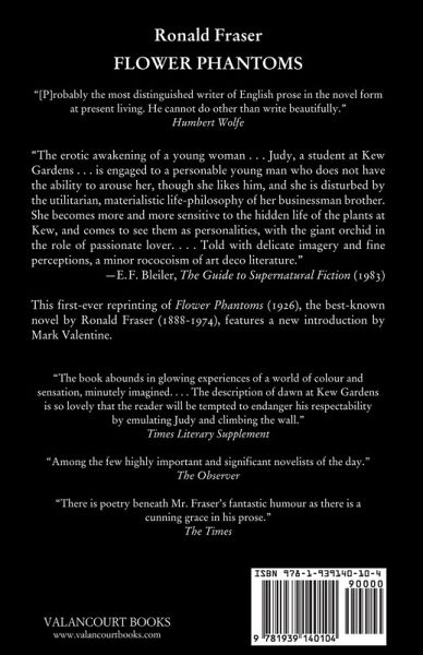 "[P]robably the most distinguished writer of English prose in the novel form at present living. He cannot do other than write beautifully." - Humbert Wolfe "The book abounds in glowing experiences of a world of colour and sensation, minutely imagined. . . . The description of dawn at Kew Gardens is so lovely that the reader will be tempted to endanger his respectability by emulating Judy and climbing the wall." - Times Literary Supplement "Among the few highly important and significant novelists of the day." - The Observer "There is poetry beneath Mr. Fraser's fantastic humour as there is a cunning grace in his prose." - The Times "The erotic awakening of a young woman . . . Judy, a student at Kew Gardens . . . is engaged to a personable young man who does not have the ability to arouse her, though she likes him, and she is disturbed by the utilitarian, materialistic life-philosophy of her businessman brother. She becomes more and more sensitive to the hidden life of the plants at Kew, and comes to see them as personalities, with the giant orchid in the role of passionate lover. . . . Told with delicate imagery and fine perceptions, a minor rococoism of art deco literature." - E.F. Bleiler, The Guide to Supernatural Fiction (1983) This first-ever reprinting of Flower Phantoms (1926), the best-known novel by Ronald Fraser (1888-1974), features a new introduction by Mark Valentine.
