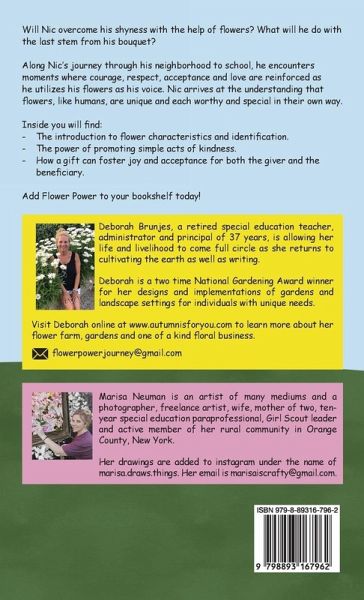 Can Nic find his voice with a little help from flowers? In Flower Power, join Nic on a heartwarming adventure through his neighborhood as he discovers the magic of flowers. Shy and unsure, Nic uses his bouquet to find courage and learn important lessons about respect, acceptance, and love. Each flower becomes a symbol of how everyone is unique and special in their own way. Inside, you'll find:Fun facts about different types of flowers and how to identify them. The joy of simple acts of kindness and their big impact. How giving a gift can make both the giver and the receiver happy. Add Flower Power to your bookshelf today and let this delightful story inspire children to embrace their uniqueness and spread kindness in their own special way!