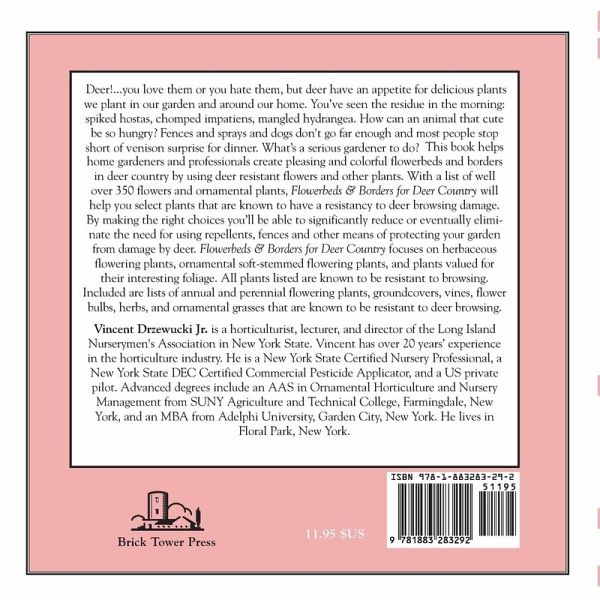 The Growing Menace-More and more, homeowners and gardeners throughout rural and suburban America have been forced to deal with a growing menace.... Deer! From coast to coast, deer have developed quite an appetite for almost anything growing in our landscapes and gardens. Deer frequently feed on flowers, fruits, vegetables and the twigs of trees and shrubs, often permanently disfiguring them. In winter, bucks rub their antlers on sapling trees and shrubs, severely damaging the bark and seriously threatening the health and life of the plant. As a result, deer have become a big a nuisance to home gardeners and professionals who design and maintain landscapes and gardens. The economic costs caused by deer browsing damage in the U.S. amounts to millions of dollars every year. Replacing plantings is one thing but even more is spent on repellents, fences and numerous other strategies for protecting landscapes, home gardens and agricultural crops from deer browsing damage. Suburban sprawl, increased abandoned farmlands and unchecked growing populations of deer are just some of the reasons deer have become such a costly nuisance around the country. This book is to help and guide home gardeners and professionals with creating pleasing and colorful flowerbeds and borders in deer country by using deer resistant flowers and other plants. With a list of well over 350 flowers and ornamental plants, Flowerbeds and Borders for Deer Country will help you select plants that are known to have a resistancy to deer browsing damage. By making the right choices you'll be able to significantly reduce or eventually eliminate the need for using repellents, fences and other means of protecting your garden from damage by deer. Flowerbeds and Borders for Deer Country focuses on herbaceous flowering plants, ornamental soft- stemmed flowering plants and plants valued for their interesting foliage. All plants listed are known to be resistant to browsing. Included are lists of annual and perennial flowering plants, groundcovers, vines, flower bulbs, herbs and ornamental grasses that are known to have a resistancy to deer browsing damage in most areas of the continental U.S. Vincent Drzewucki Jr. is a horticulturist, lecturer, and director of the Long Island Nurserymen's Association in New York State. Currently working as the horticulturist and garden shop manager of Hicks' Nurseries in Westbury, New York, Vincent has over 20 years experience in the horticulture industry. He is a New York State Certified Nursery Professional, a New York State DEC Certified Commercial Pesticide Applicator, and a US private pilot. Advanced degrees include an AAS in Ornamental Horticulture and Nursery Management from SUNY Agriculture and Technical College, Farmingdale, New York, and an MBA from Adelphi University, Garden City, New York. Vincent lives with his wife in Wantaugh, New York.